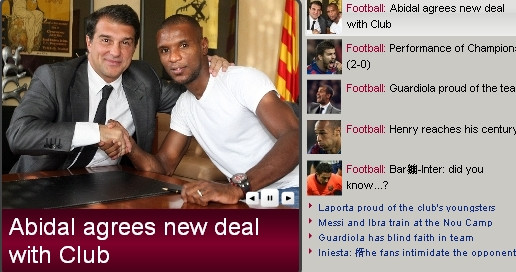 中新网11月25日电 北京时间今日,巴塞罗那官方宣布与后卫阿比达尔续约,合约将至少持续到2012年6月30日。