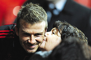 大卫·贝克汉姆终于返回他魂牵梦萦的曼彻斯特,尽管正式重返老特拉福德要等到周三,然而,在曼彻斯特机场,小贝已经享受了久违的曼联球迷狂热支持。时隔7年,“贝克汉姆狂热”在曼彻斯特丝毫没有消减,小贝在防暴警察的护送下,耐心地为球迷签名、合影,历尽艰辛才得以登上米兰大巴离开。一位疯狂的大妈甚至搂住小贝狂吻(如图),堪称小贝的超级粉丝。