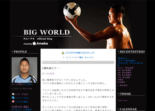 中新网6月25日电 据韩国媒体JES报道,“人民鲁尼”郑大世(27岁)在自己的博客上留下了自己对于惨败葡萄牙的感受。6月23日下午,郑大世在博客上刊登了题为《结束第二战》的文章。