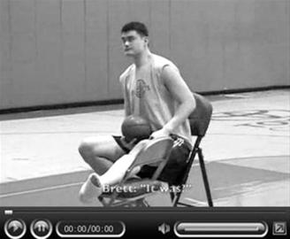到达丰田中心之后,左脚打着石膏的姚明拄着拐杖坐上火箭的摆渡车,前往训练场。在训练场上,火箭队球员主管布莱特·甘宁前来帮助姚明进行投篮训练,而姚明坐在凳子上,打石膏的左腿架在椅子上,就以坐姿进行投篮训练。