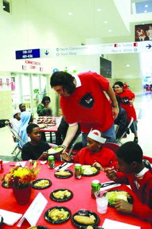 北京时间昨天,在西方传统的感恩节到来之前,火箭部分教练和球员出席了为当地无家可归的孩童举办的火鸡晚宴。斯科拉携妻子,以及巴蒂尔、海耶斯、兰德里等球员充当服务员,亲自为这些孩子上菜,就连火箭熊也扮成服务员。