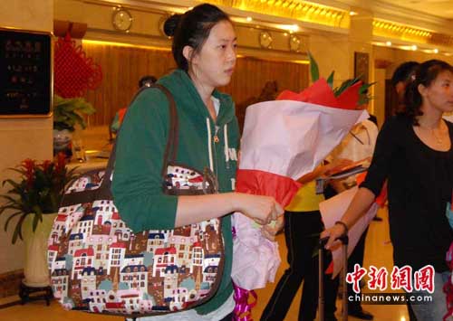 由于飞机晚点,中国女排姑娘抵达我市比原定时间足足晚了1个多小时。当大巴车停稳以后,女排领队胡进第一个走下车来,向众人打招呼,紧随其后的则是身着米黄色T恤衫的主帅王宝泉,随后15名队员陆续下车,接受学生们献上的鲜花。