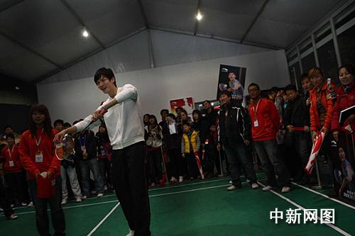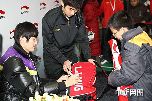 中新网上海十一月二十三日点(宗晨亮)日前,中国羽毛球名将鲍春来来到“2009李宁・中国羽毛球公开赛”球迷体验区,和球迷们进行了互动活动,还为大家签名留念。有意思的是,小鲍的球迷多数都是女性,主持人也拿此事和他开玩笑。