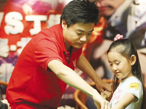 昨天活动现场丁俊晖还当起了老师,学生是在热播剧《大生活》中扮演张国立女儿的8岁童星蒋依依。在谈到初次为人师的感受时丁俊晖直言:“第一次当老师感觉比较困难,她也是第一次接触台球,我第一次接触台球都打不到球,她还碰到白球,表现很不错了。”