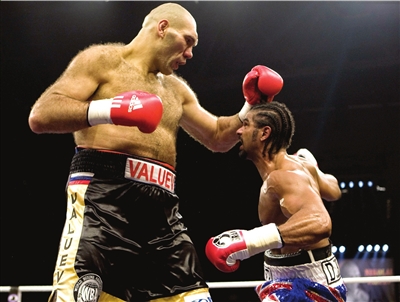 昨天,英国拳坛巨星大卫·海耶(右)战胜了俄罗斯巨人瓦鲁耶夫(左),夺得了WBA重量级拳王的金腰带。
