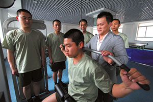 近日,奥运举重冠军张国政出现在北京市消防局,在新成立的警体俱乐部内指导消防战士正确健身。