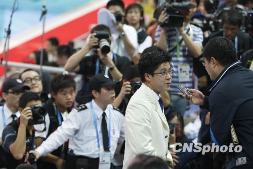 昨天东亚运的跳水比赛,当现场司仪介绍队员名单时,霍启刚起身走出贵宾室,来到看台上的贵宾席。此时,记者乘机进了贵宾席,“潜伏”在霍启刚的后一排,与他的距离不到30厘米。