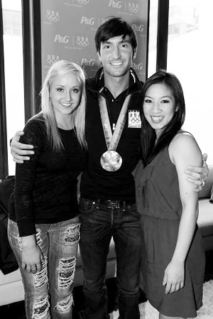 温哥华冬奥会夺冠后,美国帅哥莱萨切克接受了师姐关颖珊的采访。同为美国花滑传奇教练卡罗尔的弟子,莱萨切克在关颖珊面前很是谦逊,他还带来女友柳金和关颖珊一起合影。
