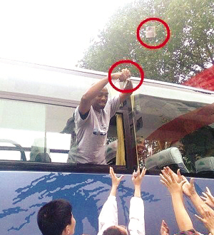 5月23日晚上,湖南湘西某地有关方面邀请美国体育使者男子明星篮球队与立陶宛苏托瓦职业男子篮球队在该地体育馆举行对抗赛。赛前,两支球队分别到当地的一些中学进行访问,然而,在5月22日美国体育使者男子明星篮球队到市第一中学访问时出现让人愤怒的一幕,一美国球员在车辆离开校园时打开窗户,向围观的中学生撒人民币,造成现场一度失控。