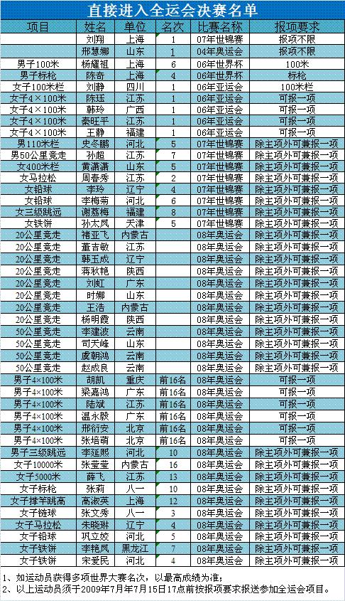 7月10日,中国田径协会公布了直接进入全运会决赛的田径运动员名单。刘翔、邢慧娜、黄潇潇、周春秀等45名选手列入名单。入选名单的运动员还必须在2009年7月15日17时前,按报名项目要求报送参加全运会比赛的报名申请。