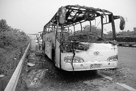 昨日上午11时30分,几名交警正在现场指挥拖车把这辆烧得面目全非的客车拖走。记者看到,这辆车牌为川A79769的客车已被烧成了黑漆漆的光架子,车内30多把座椅也只剩下铁架,右侧的车头裂了一条一米多长的缝隙,车尾的后挡板完全被烧毁,露出了车内的零件。地面更是一片狼藉,黑水横流,空气中弥漫着一股浓烈的焦臭味。