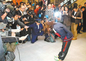 背着一大包行李的福原爱并未停下过脚步,她只是边走边微微向四周点头致意,并轻声道:“引起如此大的骚动,对不起了。”