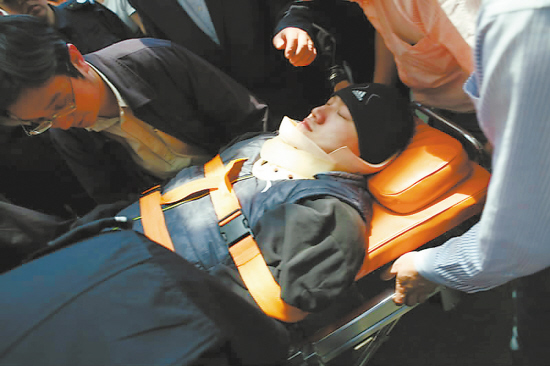 “帽子!借顶帽子!” 几位先行下车的陪同人员,先从医院保安那借了顶帽子。大约3分钟后,车门才打开,躺在担架上的汤淼被6名保安抬下车,并径直送往病房——虽然气温高达27摄氏度,汤淼仍穿着大衣,戴着线帽,就连脸部也被那顶保安帽遮得严严实实。
