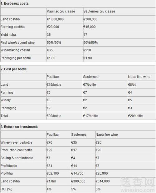 Valette同时还将苏玳和波亚克葡萄酒的酿造成本与一瓶顶级的纳帕谷赤霞珠混酿葡萄酒进行对比,结果表明,一瓶优质的美国纳帕谷葡萄酒酿造成本高于苏玳,而低于波亚克。