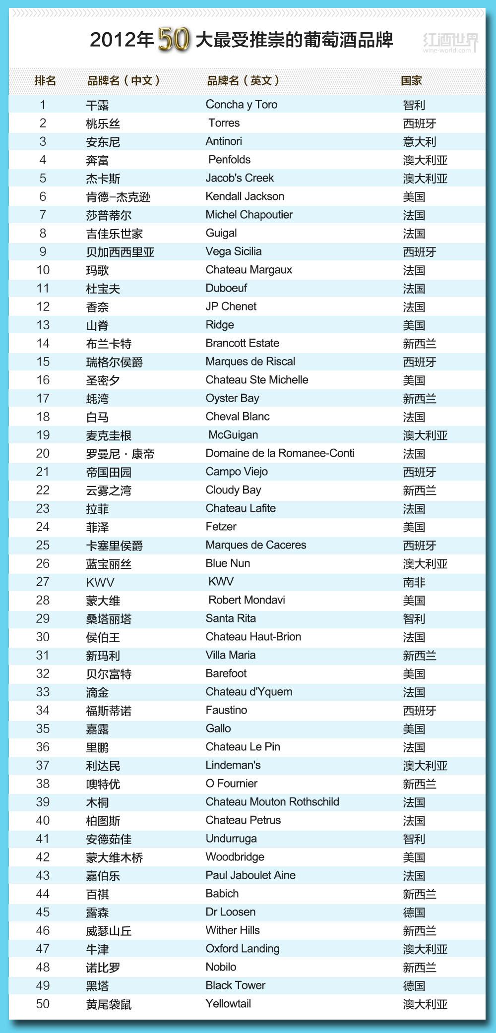 参与互动(0) 英国饮料行业权威杂志 Drinks International评选出了2012年全球最受尊崇的葡萄酒品牌。从排行榜中可以看出,干露(Concha y Toro)依旧是世界上最受尊崇的葡萄酒品牌。而法国最受尊崇的葡萄酒品牌既不是罗曼尼 康帝,也不是拉菲,而是罗讷河谷的莎普蒂尔酒庄(M. Chapoutier)。(Drinks International)