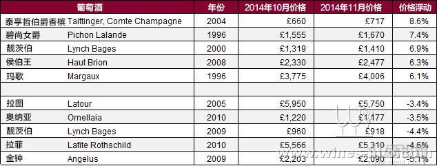 参与互动(0)2014年11月,Liv-ex佳酿100指数(Liv-ex Fine Wine 100 Index)上升了0.3%。佳酿100指数是葡萄酒行业的主要基准,它代表世界上最受欢迎、在二级市场表现最活跃的100款佳酿的价格波动情况。佳酿100指数经历了之前17个月的大幅下跌之后,近期开始缓慢回升。而相比10月份,佳酿50指数下降了0.2%。