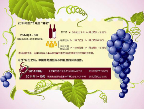 与葡萄酒产量出现增长相同的是,市场销售业绩开始向好。2014年前个10月,我国葡萄酒行业实现收入329.69亿元,同比增速为4.56%;实现利润总额32.54亿元,同比增速为1.54%。