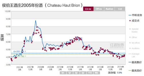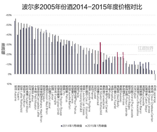 从那以后,人们对2005年份酒的看法也发生了改变,就连帕克也在2014年下半年对其中几款酒进行了重新品评。上图显示了过去一年里各波尔多佳酿2005年份酒价格的变化。尽管大多数酒的价格仍在下跌,但是下图中的红线则表明了近来的积极信号。2014年12月,帕克重新品评2005年木桐(Mouton Rothschild),并给出99+的超高分,这无疑是一个极大的利好消息,因此该年份的木桐价格也有了显著上升。2014年1月,木桐的价格相距其最高价已下跌了32.5%,但目前这一跌幅已收窄至22.4%。此外,高柏丽(Haut Bailly)和梦玫瑰(Montrose)也在帕克的重新品评中获得更高的分数,因此在过去的一年里也都表现出了相当的潜力。难道这些就预示着波尔多2005年份酒又要开始涨价了?让我们拭目以待吧。(编译/Kyle)