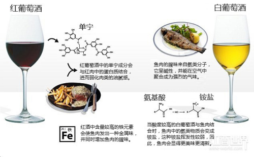 引起鱼肉发“腥”的物质是氨类分子。该类分子在遇到葡萄酒中的酸时会变成铵盐,铵盐的挥发性较弱,一般无法为人们的鼻子闻识到。在鱼肉的腥味减弱时,白葡萄酒中突出的酸味也会减弱,这样,口腔中的饮食就会变得柔和爽口。
