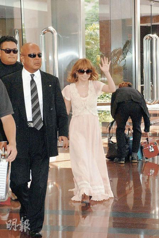 昨午1时许,有工作人员将大批行李搬上货车,当中不乏名牌行李。步姐则于近2时离开酒店,穿着一袭粉红色低胸长裙、满脸笑容的她,见到大热天时仍在门外守候的数十名粉丝热情挥手打招呼,然后一如过往有求必应,帮粉丝签名兼合照,粉丝送上心意卡及礼物,还合唱偶像的名曲。