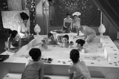 片中,有一场蔡卓妍和众多宫女在大型浴缸洗澡的场景戏。唯美的场景,加上众多的美女,令整个画面看起来相当养眼。记者从片方处得知,为了打造这段场景戏,投资方不惜花费重金,耗资金百万打造豪华皇宫,周边的布景和摆设也是全部按照皇室宫廷级别设计。置身于这样的场景拍洗澡戏,蔡卓妍也表示,“真的享受了皇后的待遇”。