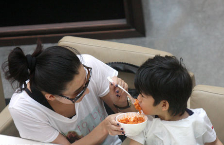 张柏芝喂Lucas吃饭