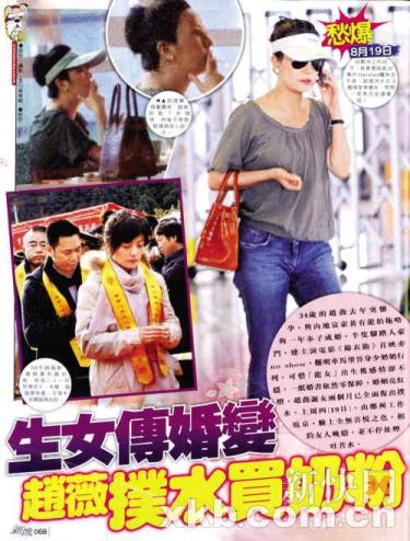 今年四月,有网民绘声绘影爆赵薇已在新加坡一贵族医院产女,旋即引来大批传媒追访,并拍到黄有龙到医院探望,身兼赵薇经纪人的亲嫂子,在官网承认她已婚兼诞下BB。据知,此举惹得向来低调的黄有龙非常不满,加上向来"恨仔"(想要儿子)的他对于今胎生女令二人关系雪上加霜,难怪赵薇接受访问坦言:"我觉得富豪、豪门离我生活还很有距离。"又自爆即将复出,坐月期间,赵薇已毅然接下一连串广告和代言产品,靠自己揾奶粉钱,从6月中产后首曝光,出席上海电影节后,不断工作来赚钱。上周三(18日),赵薇飞到郑州出席食品发布会,翌日下午回京,戴上黑超和太阳帽的她,一身便服但不忘挽着Hermes鳄鱼皮手袋显富贵,往车场路上她一直愁眉不展低头讲电话,然后登上奔驰房车往三里屯路,到盛传是她开设的乐福餐厅与友人饭叙。到达自己地头明显松懈,点了杯斋啡便不断扯烟吹水。其间,面对大班友人谈天说地仍挤不出半点笑容,结果坐到未够九点已经散band返家。(新快报)
