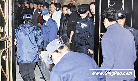 工人进入邓光荣的大宅准备将其遗体移走。 图片来源:香港“成报”