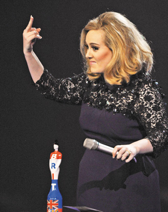 阿黛尔日前横扫6项格莱美大奖成最大赢家,先前就被看好在全英音乐奖继续扬威,昨不负众望共拿下“最佳英国女歌手”与“最佳英国专辑”(《21》),当她上台领取后者奖项时,在发言表达衣锦还乡领取大奖的激动心情时,主持人突然打断她,因为等在一旁的布勒合唱团(Blur)即将登台演出。来不及感谢歌迷的阿黛尔一脸恼火,手一扬,比出不雅手势。