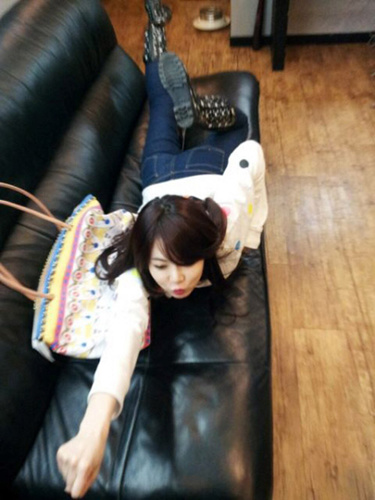 金泫雅录音室大玩角色扮演 趴沙发高举右臂扮超人