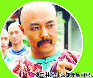 自从演了《还珠格格》里的皇帝之后,张铁林就成了皇帝专业户,尔后他不管演什么角色,给人的感觉都是同一腔调。有网友总结出张铁林的经典表情套路:“挤眼,皱眉,扬头。”也有网友评论:“皇阿玛演戏永远那么爱吹胡子瞪眼,一惊一乍,演什么都像皇阿玛。”不过,有观众则认为,张铁林将皇帝这一角色揣摩到位,让人一想起皇上的角色就会想找他来演,也是一种成功。
