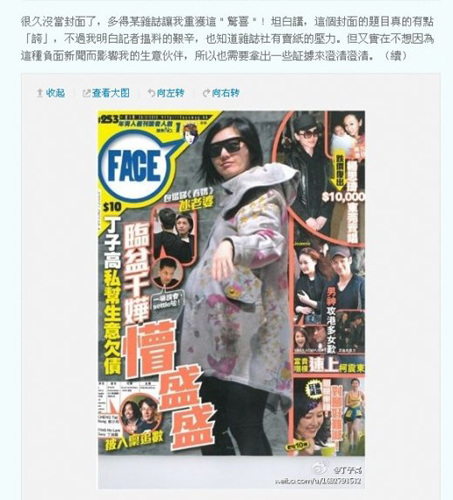 随后,丁子高再发微博详细解释了杂志传闻债务纠纷的来龙去脉,直言因前业主的疏忽将自己告上法庭,自己才是最大的受害者,“杂志說我欠债十万买楼订金(说欠债大气点,不如一千万吧)事实是我有正常投资买楼,付了定金支票,转名手续也办妥,但去年底业主突然寄上律师信说两年前订金支票过了期无法兑现!说起來我才是受害者!是前业主没有准时兑现支票(通识:支票需在半年內兑现),两年后却反告我,真是莫名其妙!现在事件已解决。”