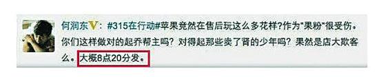 这条冠以“315在行动”之名的微博立即在网上一石激起千层浪,有网友指出最后那句“大概8点20分发”相当诡异。结合当晚央视正在直播“315晚会”再加上内文批评苹果产品在中国的售后服务,很快就有人联想到何润东的这条微博是出自央视的授意,而最后那句“大概8点20分发”,显然是对方给何润东的“特别嘱托”,没想到何润东在发微博时不小心忘记删了。