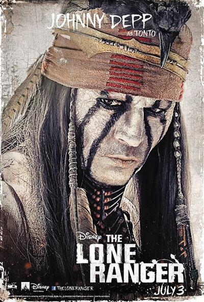 约翰尼·德普主演的新片《独行侠》昨天发布新款角色海报,德普饰演的印第安人通图脸色苍白,造型古怪,头上还戴着死鸟头饰,扮相走的依然是《加勒比海盗》中的怪异路线。
