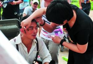 樊少皇在横店拍戏间隙,化妆师为他补妆。 信息时报记者 萧嘉宁 摄