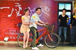 电影《一座城池》发布会现场,主演房祖名、小薰骑着自行车上场。