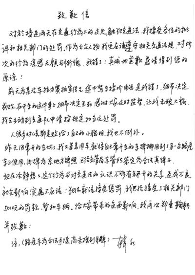 4日下午,在《中国梦之声》直播开始前,韩红又手写了一封道歉信,在信中坦承了连续两日过失的原因,“人很多时候败给自己的小聪明,我也不例外”。我对自己的行为感到无颜与惭愧!痛苦至极!再次郑重道歉!对于接连两天在交通行为上的过失,触犯交通法,我接受各位的批评和相关部门的处罚。作为公众人物我更应该遵守相关交通法规。对此次的行为深感无颜与惭愧,我错了!真诚地道歉,恳请得到您的原谅!”