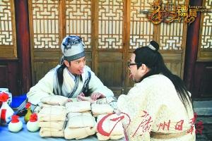 (记者 林芳) 《龙门镖局》首播后人气火爆,陈晓、印小天、黄晓明等明星先后客串捧场,成为观众和粉丝们津津乐道的话题。片方也于前日曝光了黄晓明在片场的私密剧照,在剧中出演盲人的黄晓明,穿着古装戏服与同一集现身的张一白一起吐舌卖萌(上图),更拿起手机与网络红人孔二狗玩起自拍。