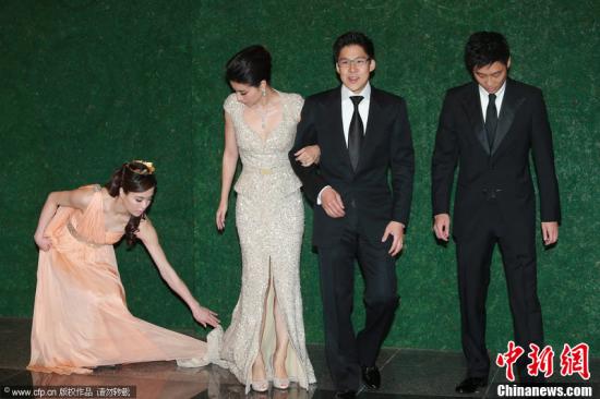2012年11月11日,香港,郭晶晶、霍启刚香港婚礼在香港会议展览中心举办。郭晶晶霍启刚一言不发只供媒体拍照,但似乎礼服过长,吴敏霞不小心踩到了郭晶晶裙摆,弯腰帮忙整理。 图片来源:CFP视觉中国