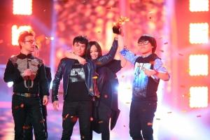 李琦(右一)夺得第二季《中国好声音》冠军,他的导师阿妹(右二)很激动,不过阿妹在颁奖时安慰拿到亚军的张恒远(左二)。