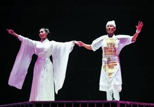 音乐剧讲述一个秦俑穿越到民国后遭遇的凄美爱情故事,换上白色古代兵士服的刘德华与女主角在水幕两旁隔空相望,最终在水幕中相会,显得别致而又浪漫。