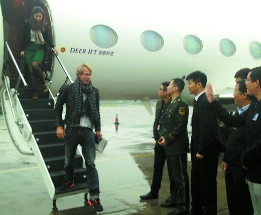 晨报记者换乘一辆考斯特面包车进入停机坪,随后开始了半个小时的等待。15:02,搭载迈克尔一行的包机总算安全降落,记者作为翻译人员在舷梯外欢迎来宾。记者注意到,迈克搭乘的公务机为知名的湾流G450型公务机,含税价格为3688万美元。