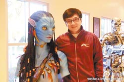 成龙还开心与《阿凡达》片中“纳美公主”、《终结者》机器人模型合影留念。