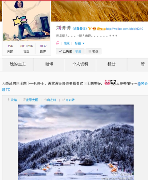 刘诗诗隔空恩爱喊话男友吴奇隆:带我去旅行。(点击图片翻页)