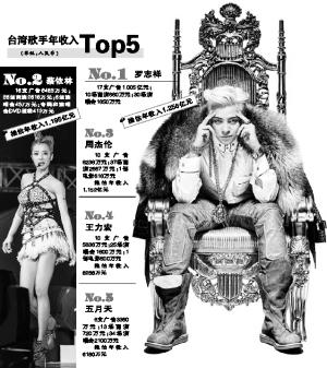 罗志祥今年首度登顶收入榜,他在今年年初就比其他台湾歌手提前进入吸金状态,全年演出30场的巡回演唱会,加上接拍17支广告代言,推估年收入高达6.1亿元新台币,成为台湾歌手年度吸金王。