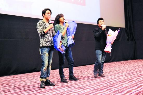 (记者张博)昨日下午,“水木年华”组合主唱卢庚戌的电影导演处女作《怒放2013》主创来到安溪金逸影城为该片进行宣传,影片讲述四个充满中年危机的男子重组摇滚乐队、追寻青春梦想的故事,由潘粤明、秦昊、杜海涛等主演。当天潘粤明和水木年华组合来到现场和影迷们进行了互动,其中潘粤明更是遭遇一名女性粉丝示爱,超有风度的潘粤明用一束鲜花给予回应。