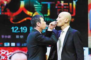 在《私人定制》发布会上,冯小刚(左)和葛优喝“交杯酒”。小新发