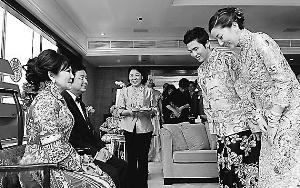 一对新人恭敬地向蔡志明以及蔡太敬茶。