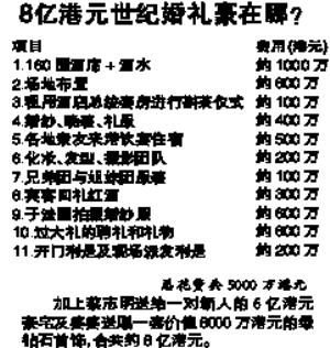 蔡加赞与汪圆圆日前正式注册行礼后,前晚举行豪华婚礼。蔡志明送上预备了的6亿港元豪宅及800万港元礼金作为儿子的结婚礼物,而蔡太就送赠逾5000万港元珠宝首饰给媳妇,连同斟茶时的金猪项链,以及长辈们赠送的12对龙凤手镯等200万港元首饰,此外还有法国婚照摄影、160围酒席等,总数约8亿港元,非常豪气!