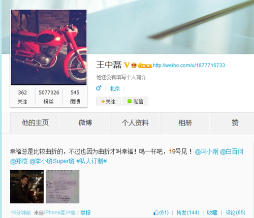 王中磊微博截图